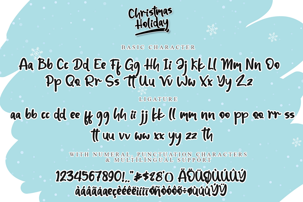 Christmas Holiday is a fun and cute display font. It has a playful style and great readability. It’s perfect for Christmas cards, branding, stationery, blog design, custom art, custom stamps, custom embossers, book, apparel, packaging, headline, or much more! It will add a unique feel and looks stunning to any design project! This font is PUA encoded which means you can access all of the cute glyphs with ease! It also features a wealth of including ligatures.
